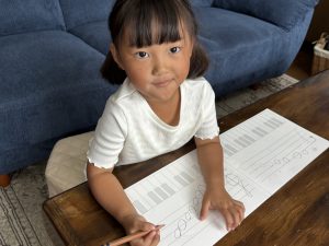今年度からレッスンを始めているHちゃん(年中)は、ト音記号の「真ん中のド」から「高いド」まで。ヘ音記号は「真ん中のド」から「低いド」まで、上手に⚪︎も書けるようになりました🤗‼️